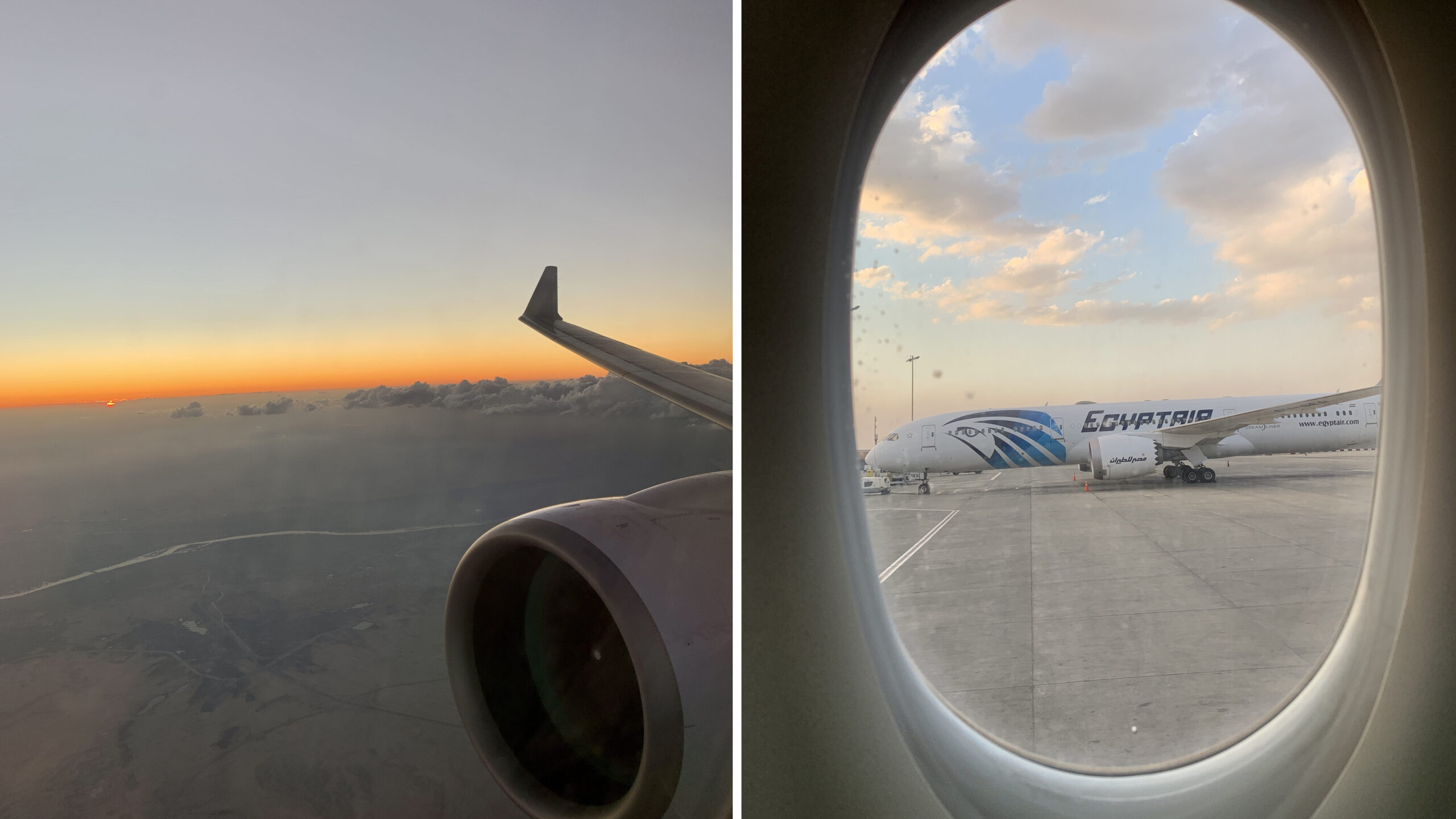 El avión estaba a punto de aterrizar en el aeropuerto de El Cairo al anochecer, justo cuando el sol ya se estaba escondiendo, así que pude ser testigo y apreciar desde el avión, un maravilloso atardecer en el desierto. Primera vez que presenciaba algo así, fue muy especial y único 🏜🐪 justo unos minutos antes de aterrizar.
