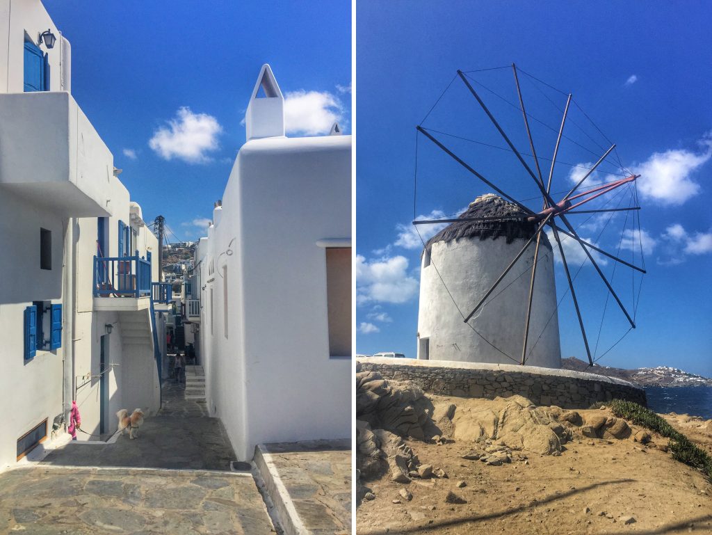 Perderte por sus laberínticas y estrechas calles, fotografiar las miles de casitas blancas con ventanas azules y llenas de flores, singulares y únicas en su estética, enamorarte de la “Pequeña Venecia” (Little Venice) una de las zonas más bonitas de Mykonos, encontrar hermosas y recónditas iglesias, sucumbir en sus tiendas locales de artesanías, recorrer el antiguo puerto y subir hasta la parte alta de la ciudad para ver sus blancos Molinos de Viento, donde se puede disfrutar de la mágica puesta de sol y captar la colorida luz que baña a Chora (capital de la isla), definitivamente es sorprenderte a cada paso que das, pura magia y felicidad!