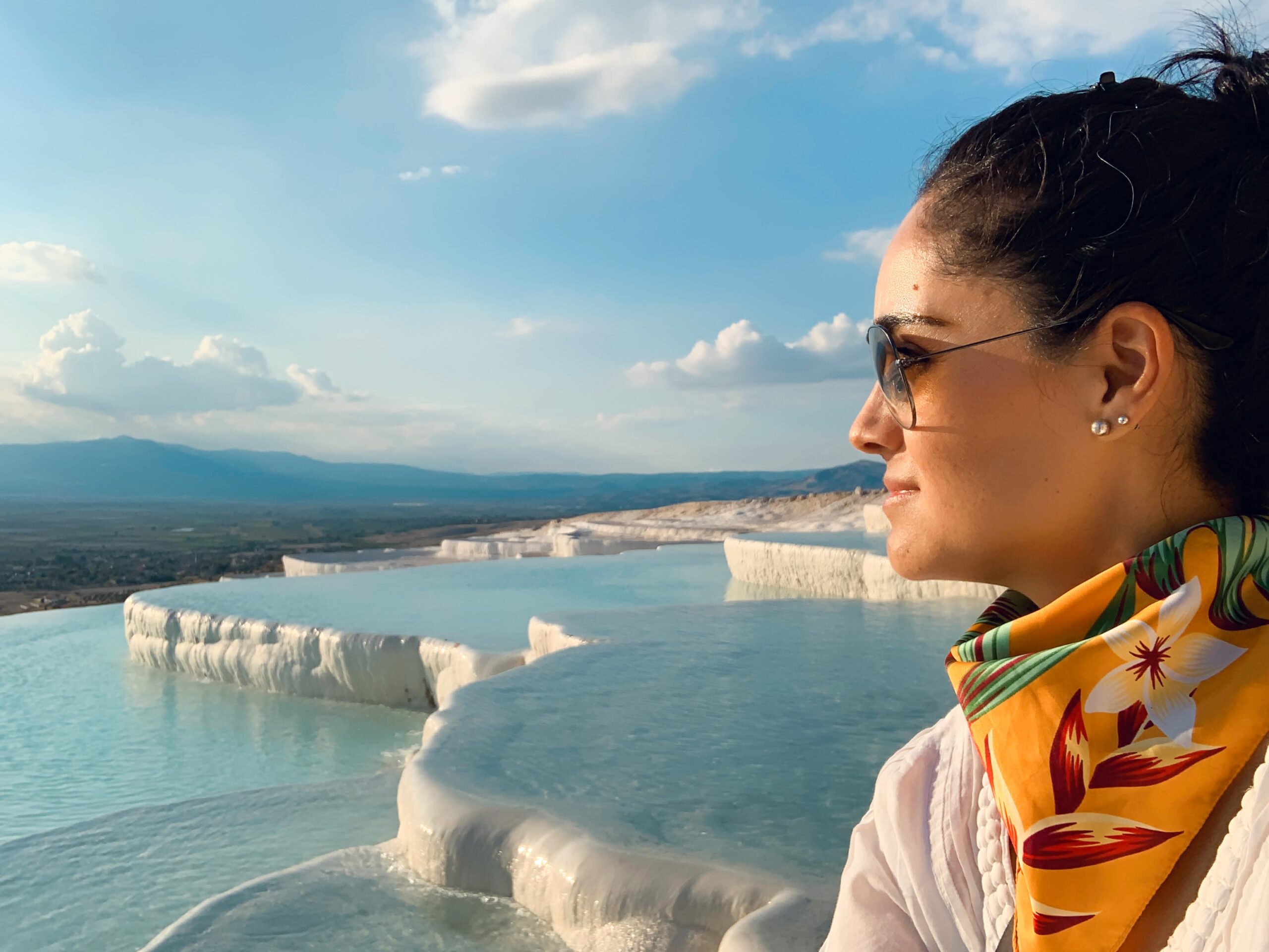 “El Castillo de Algodón Turco” es una joya de la naturaleza… Resplandecientes piscinas naturales de piedra caliza que crean un lugar de manantiales de otro mundo. Uno de los lugares más mágicos de Turquía se encuentra en la provincia de Denizli, al Sudoeste del país. Movimientos tectónicos provocaron la aparición de aguas termales que han ido moldeando el lugar con los minerales que transportaban. De esta forma, se crearon terrazas calcáreas de un blanco brillante por donde corre el agua que cae de una terraza a otra. Contemplar este espectáculo de la naturaleza te llena de gozo por la combinación de colores y formas. Pamukkale ha sido un lugar de peregrinación durante milenios gracias a sus aguas termales azul hielo, a las que se atribuyen propiedades curativas. Tras ascender por acantilados de piedra caliza, las aguas caen en cascada. El calcio del agua se ha ido acumulando con el tiempo hasta formar inmensas terrazas blancas de travertino. Un paraíso escondido entre las montañas y uno de los yacimientos antiguos más importantes en Turquía se encuentra aquí, la antigua ciudad Romana de Hierápolis y la piscina de aguas termales de Cleopatra. Pamukkale es también otro patrimonio de la humanidad declarado por la Unesco. ¡Es una experiencia increíble tocar los travertinos de Pamukkale! Parece un fabuloso campo de nubes que ofrece una rara belleza natural y es un sitio donde la historia y la naturaleza se encuentran… El atardecer en este maravilloso lugar te deja sin palabras, disfrutar de los últimos rayos del sol desde una de sus terrazas de travertino, no tiene comparación alguna!